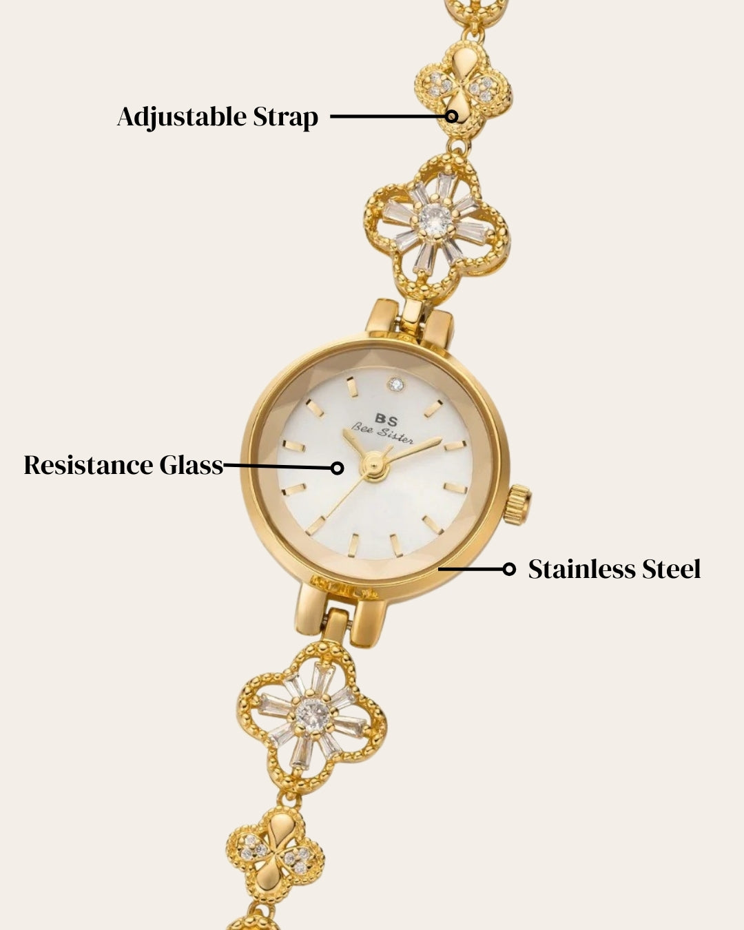 • Bracelet: Gold-plated alloy, adjustable